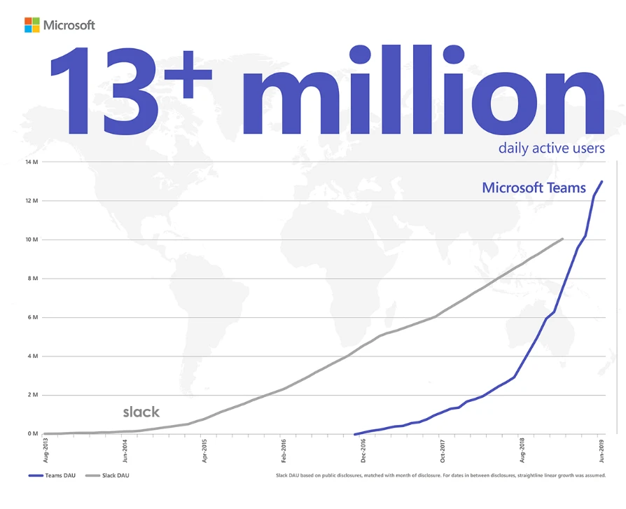 Seit 2016 ist der Microsoft-Dienst auf dem Markt. Im Juli hatte dieser bereits mehr als 13 Millionen aktiver Nutzer und zog somit am Konkurrenten Slack vorbei, die zum damaligen Zeitpunkt auf "nur" zehn Millionen DAUs kamen.