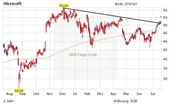 Nach den überzeugenden Quartalszahlen hat die Aktie von Microsoft im nachbörslichen Handel um knapp vier Prozent zugelegt. Die seit Herbst 2015 bestehende Konsolidierung ist damit beendet. Das nächste Kursziel liegt nun bei 53,00 Euro. Wird der Widerstand von 56,85 Euro, der im letzten Dezember ausgebildet wurde, überschritten, winken schnelle Anschlussgewinne. Microsoft ist aus historischer Sicht mit einem KGV von 19 nicht gerade billig. Der unerwartete Erfolg von Bing und die ordentliche Performance von Azure dürften aber für Rückenwind sorgen. Die AKtie ist nach wie vor ein klarer Kauf.