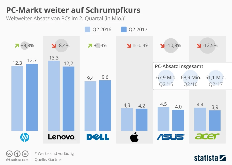 Doch nicht alle Sparten des Software-Giganten legten zu. Das Segment „More Personal Computing“, welches das Windows-10-Geschäft mit Privatkunden und PC-Herstellern umfasst, verzeichnete ein Minus von zwei Prozent. Ursache hierfür ist der im gleichen Zeitraum um vier Prozent schrumpfende PC-Markt.