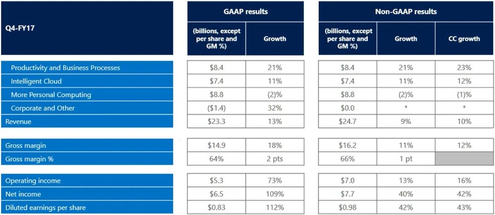 Microsoft übertraf im abgelaufenen vierten Quartal 2017 die Erwartungen der Analysten. Der Umsatz wuchs im Vergleich zum Vorjahresquartal um 13 Prozent auf 23,3 Milliarden Dollar, der operative Gewinn legte im Jahresvergleich von 3,1 auf 6,2 Milliarden US-Dollar zu.