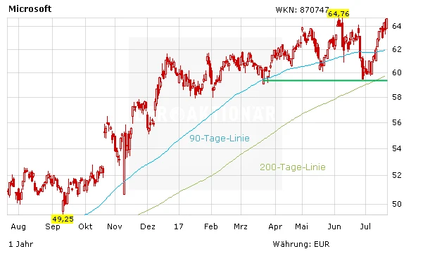 Die guten Zahlen zeigen jedoch, dass die Umstrukturierung durch Microsoft-Boss Satya Nadella der richtige Weg für den Konzern ist. Insbesondere das anhaltende Wachstum im Cloud-Geschäft ist für Microsoft wichtig und dürfte in Zukunft zu weiteren Kursgewinnen führen. Langfristig sieht DER AKTIONÄR das Kursziel bei 75,00 Euro.