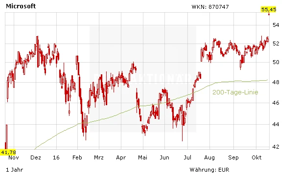 In der Nacht von Donnerstag auf Freitag gab Microsoft seine Quartalszahlen bekannt. Der bereinigte Umsatz liegt mit 20,5 Milliarden Dollar nur minimal über Vorjahresniveau. Die Aktie konnte nachbörslich trotzdem um sechs Prozent zulegen und überschritt das Rekordhoch von 1999.