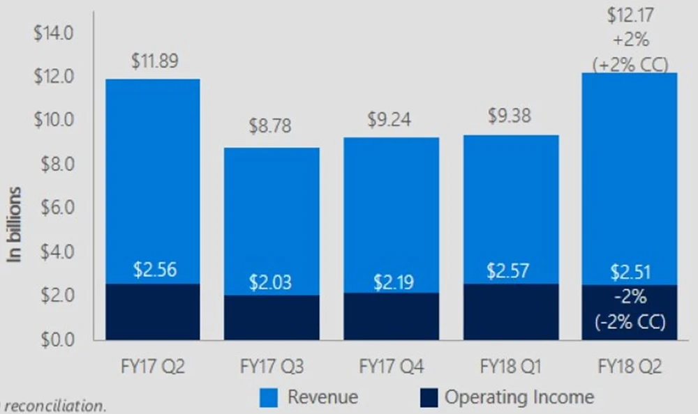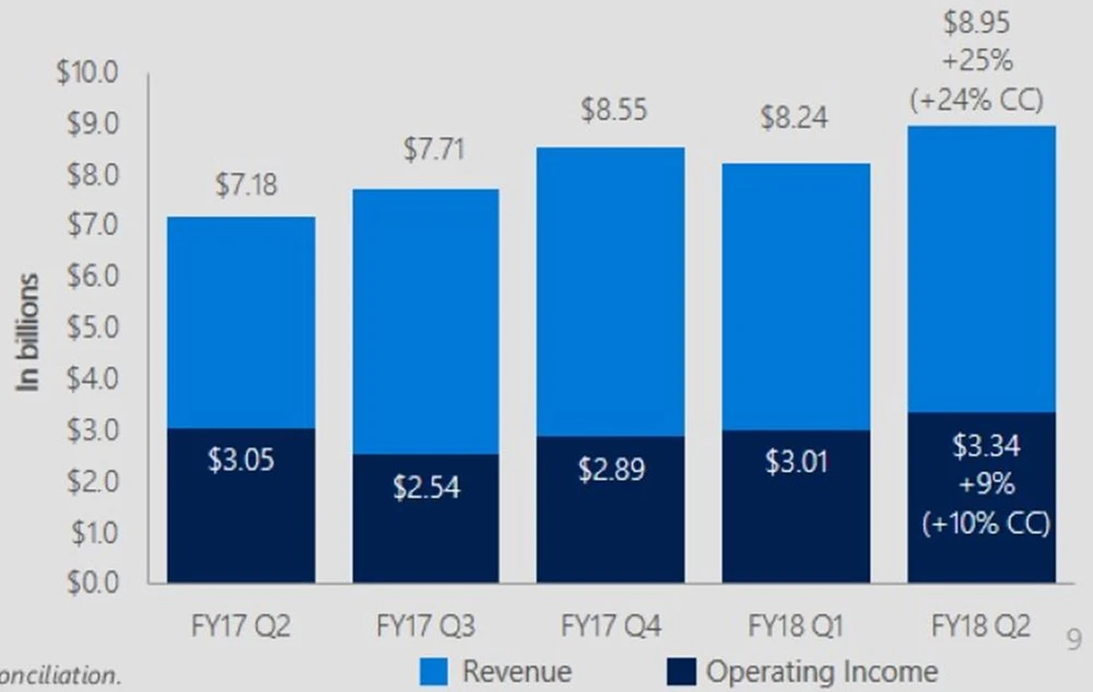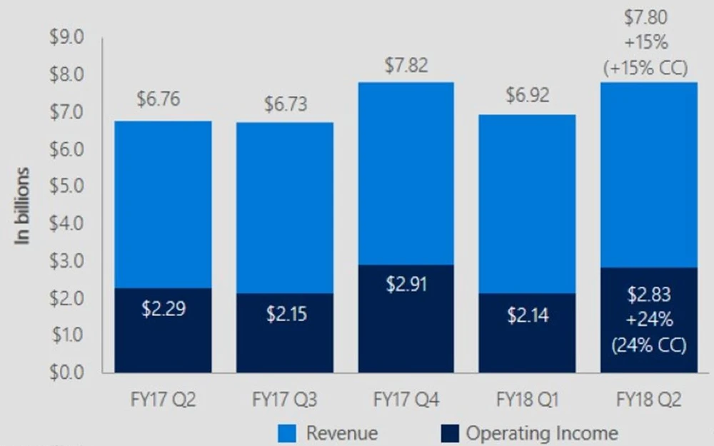 Damit legte der gesamte Erlös gegenüber dem Vorjahr um 12 Prozent zu – die stärkste Wachstumsrate seit drei Jahren. Das liegt insbesondere an den neuen Wachstumssegmenten „Intelligent Cloud“ und „Productivity and Business Process“.
