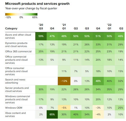 Im zweiten Quartal hat Microsoft in nahezu jeder seiner Sparten zugelegt (siehe die Grafik unten). Wichtig: Das Segment "Intelligent Cloud", in welches Azure eingebettet ist, legte im Vorjahresvergleich um satte 26 Prozent auf 18,33 Milliarden Dollar zu. Azure selbst konnte mit einem Umsatzplus von 46 Prozent glänzen und wächst damit nach wie vor deutlich schneller als der Erzrivale AWS. Allerdings fiel das Azure-Wachstum diesmal etwas schwächer aus, als in den vergangenen vier Quartalen (+50% oder mehr).