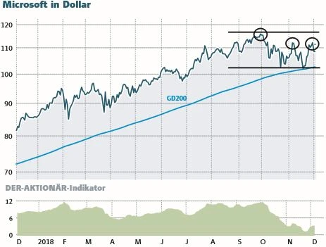 Das Sentiment gegenüber der Microsoft-Aktie ist hingegen vergleichsweise intakt. Die Unterstützung bei der 200-Tage-Linie hat gehalten. Zudem hat das Papier bereits zweimal die Marke von 112 Dollar getestet. Sollte diese durchbrochen werden, ist das Zwischenhoch bei rund 116 Dollar nicht weit entfernt. Anleger bleiben dabei.