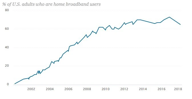 Die Versorgung mit einem Breitbandzugang in den USA zeigt die untenstehende Grafik. Die Anzahl der Amerikaner mit High-Speed-Internet stieg rasant zwischen 2000 und 2010. In den letzten Jahren gab das Wachstum jedoch nach.