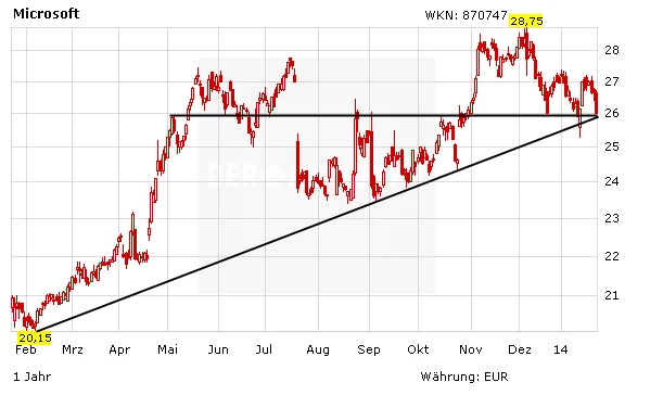 Die guten Quartalszahlen zeigen, dass Microsoft die Schwäche bei den Betriebssystemen kompensieren kann. Die Chancen stehen daher gut, dass die Aktie nicht nur kurzfristig Fahrt aufnimmt. Wird auch die Ballmer-Nachfrage zur Zufriedenheit der Anleger geklärt, könnte die Aktie sogar bis in den Bereich von 38 Euro vorstoßen. Charttechnisch sieht es ebenfalls gut aus, nachdem die Marke von 26 Euro verteidigt werden konnte. Ein Stopp bei 22,50 Euro sichert ab, sollte es kurzfristig doch noch einmal turbulenter werden.