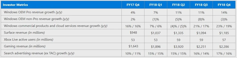 Die größte Sparte „More Personal Computing“ rund um Windows, Surface-Book, Gaming und Werbeeinnahmen legte um 17 Prozent auf 10,81 Milliarden Dollar zu. Windows, das ehemalige Flaggschiff des Konzerns, bringt dabei immer noch nennenswerte Erlöse ein und konnte im vergangenen Quartal von den steigenden PC-Verkäufen profitieren. Auch die Gaming-Segmente konnten gegenüber dem Vorjahresquartal noch einmal deutlich zuwachsen, obwohl die aktuelle Xbox bereits etwas in die Jahre gekommen ist. Grund hierfür sind insbesondere die von Windows vertriebenen Spiele und das Gaming-Abo Xbox Live.