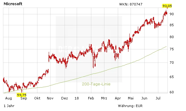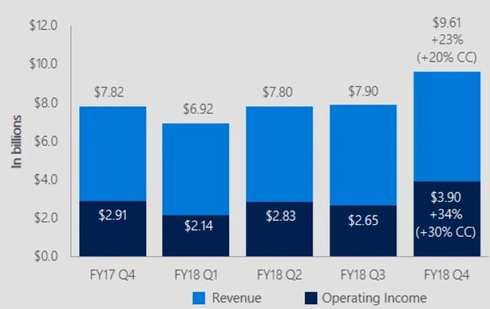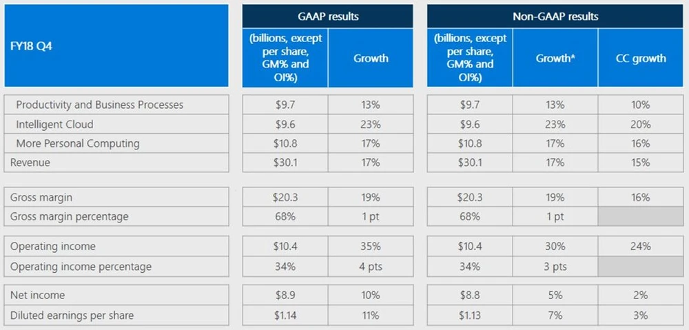 Microsoft erzielte im vierten Quartal 2018 (bis 30.Juni) einen Umsatz von 30,09 Milliarden Dollar und übertraf damit die Schätzungen der Analysten von 29,22 Milliarden Dollar. Die jährlichen Erlöse knackten damit zum ersten Mal die magische 100 Milliarden Dollar Marke. Der Gewinn je Aktie lag mit 1,13 Dollar ebenfalls höher als die Erwartungen von 1,07 Dollar.