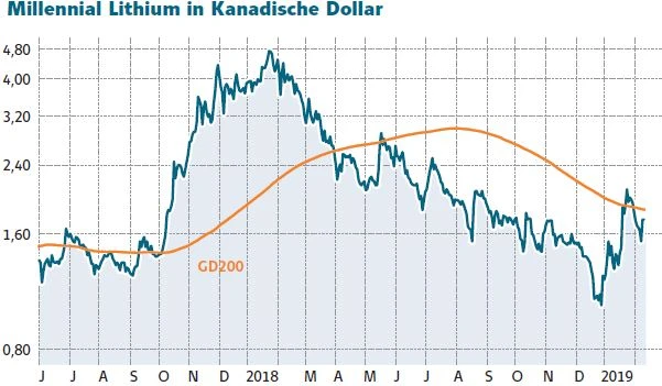 Einer dieser Werte ist Millennial Lithium. Das Unternehmen hat ein hervorragendes Management, starke Projekte und neben weiterhin einigen Millionen in der Kasse auch Zugang zu frischem Kapital. Das Papier hat sich seit Ende Dezember zwischenzeitlich verdoppeln können, ist anschließend aber wieder in eine Konsolidierung übergegangen. Nun könnte der nächste Schub kommen. Am gestrigen Montag ist das Papier in Toronto mit einem Kursplus von 13,7 Prozent aus dem Handel gegangen.