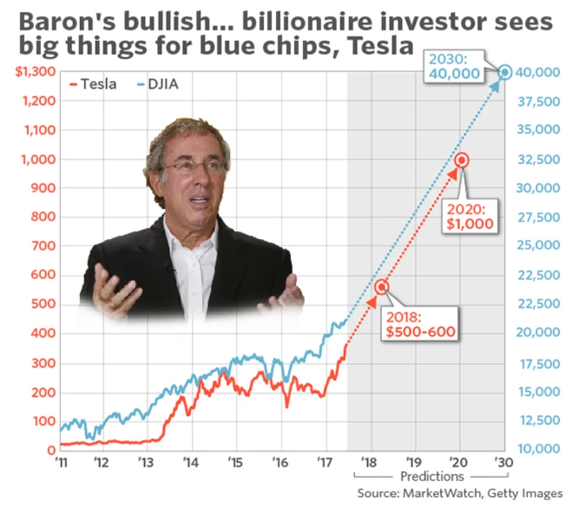 Besonders bullish ist Baron für Tesla. „Im kommenden Jahr kann die Aktie die Marke von 600 Dollar überwinden. 2020 sollten dann die 1.000 Dollar erreicht werden.“ Heißt: In den kommenden zwölf bis 18 Monaten hat Tesla laut Baron ein Potenzial von 50 Prozent. Bis 2020 sind es 170 Prozent.