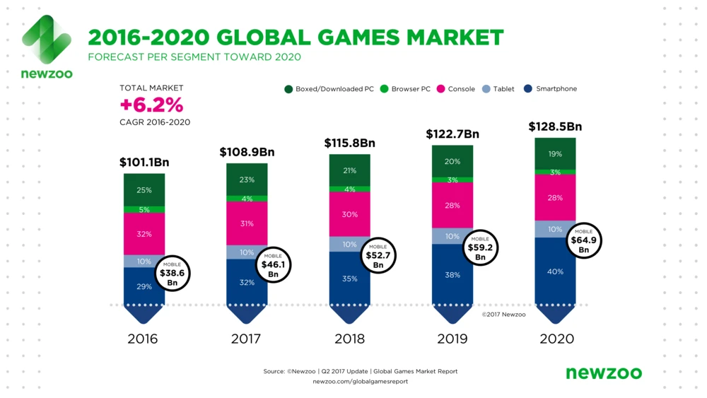 Der deutsche Gaming-Markt ist im der ersten Jahreshälfte damit sogar stärker gewachsen als der globale Videospielmarkt. Das Marktforschungsunternehmen Newzoo rechnet damit, dass die weltweiten Gaming-Umsätze im Gesamtjahr 2017 um 7,7 Prozent auf 108,9 Milliarden Dollar (rund 92,4 Milliarden Euro) wachsen. Bis zum Jahr 2020 prognostiziert Newzoo einen Anstieg auf 128,5 Milliarden Dollar, was einem jährlichen Anstieg um durchschnittlich 6,2 Prozent entspricht.