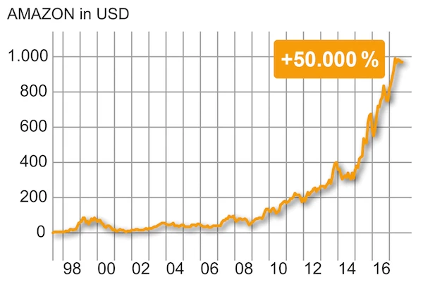 Ich hatte eine Ahnung, dass hier etwas ganz Großes entstehen kann und habe mir auch durchaus vorstellen können, dass die Bewertung in einigen Jahren die Milliardengrenze erreichen und überschreiten kann. Doch es ging alles schneller, viel schneller. Schon im Oktober 1997, nur fünf Monate nach dem Börsengang, hatte sich der Kurs von Amazon verdoppelt und das Unternehmen war an der Börse über eine Milliarde Dollar wert. 100 Prozent Gewinn in fünf Monaten – das kann sich sehen lassen, dachte ich mir. Und kam dann auf eine der dümmsten und letztlich auch teuersten Ideen meines Lebens: Meine Aktien zu verkaufen. 2.500 Mark in fünf Monaten – ein schönes Geschäft, war ich mir sicher. Geht so, denn hätte ich meine Aktien heute noch, wären sie weit über eine Million wert – und zwar Euro. Die Aktie hat bis heute um sagenhafte 50.000 Prozent zugeleget.