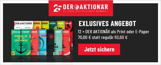 Mit dem Jubiläumsangebot von DER AKTIONÄR sichern Sie sich nur noch bis zum 31. Dezember 2021 das geballte Börsenwissen der größten Kapitalmarktredaktion Deutschlands zum Vorteilspreis. Mit diesem Abonnement lesen Sie 12 Ausgaben von DER AKTIONÄR jetzt noch für 70 Euro statt regulär 93,60 Euro. Bestellen Sie das digitale Jubiläumsabo und Sie erhalten automatisch die brandneue DER AKTIONÄR EDITION „Jahrbuch 2022“ inklusive.