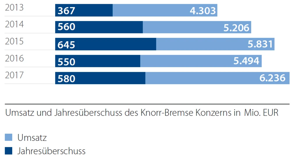 Knorr-Bremse bietet für seine Kunden Brems- und Subsysteme in den beiden Geschäftssparten Schienenfahrzeuge und Nutzfahrzeuge an. Im Jahr 2017 konnte das Münchner Unternehmen einen Konzernumsatz von rund 6,24 Milliarden Euro realisieren, eine Steigerung von 13,5 Prozent im Vergleich zum Vorjahr. Das EBITDA lag im Vergleich zu Vorjahr kaum verändert bei rund einer Milliarde Euro, der Jahresübershuss bei 580 Millionen Euro.