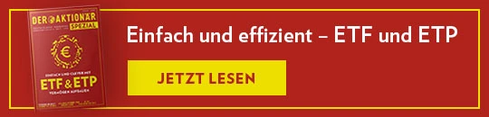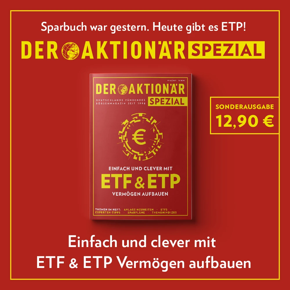 Sichern Sie sich jetzt das DER AKTIONÄR-Spezialheft „Einfach und clever mit ETF & ETP Vermögen aufbauen" für nur 12,90 Euro oder testen Sie DER AKTIONÄR vier Wochen lang im Probeabo und erhalten Sie so gleichzeitig auch die Sonderausgabe inklusive.