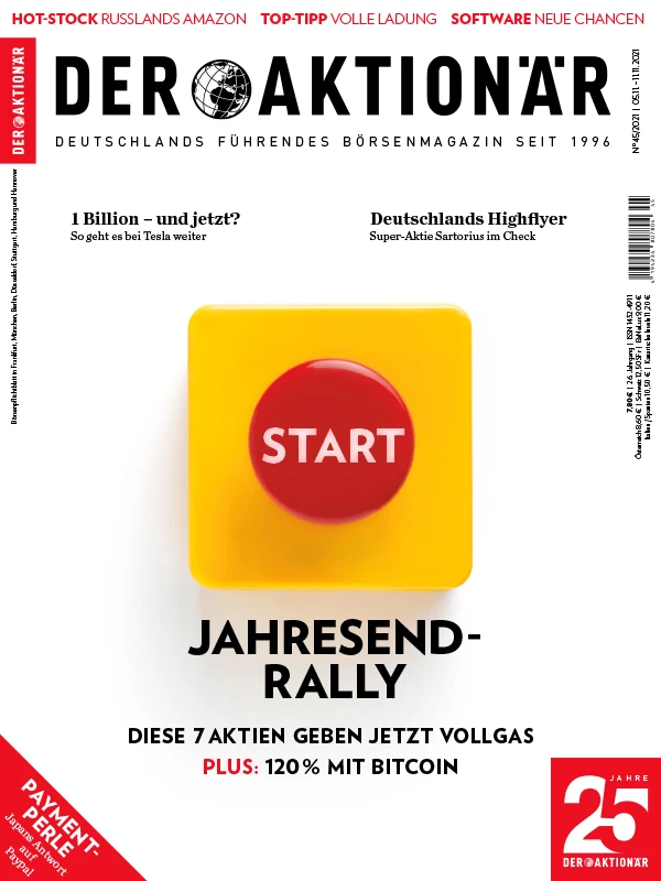 DER AKTIONÄR ist ebenfalls bullish eingestellt und präsentiert Ihnen in der neuen Ausgabe (45/21) 7 Aktien, die jetzt zum Jahresendspurt auf die Überholspur wechseln dürften. Wem das nicht genügt, den erwartet zudem mit 3 Optionsscheinempfehlungen die Chance, die letzten Prozente herauszukitzeln. Plus: Ihre 120-Prozent-Chance mit dem Bitcoin.