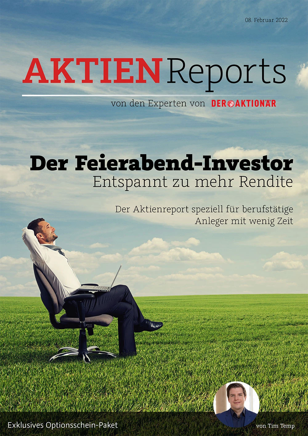 Sie sind berufstätig und haben nur wenig Zeit, Ihr Investment in die richtigen Bahnen zu lenken? Dann werden Sie Feierabend-Investor. Mit diesem exklusiven Aktienreport müssen Sie nicht ständig die aktuellen Kurse und Entwicklungen überwachen und können dennoch ruhig schlafen. Denn gerade in diesen herausfordernden, ja geradezu ungemütlichen Zeiten am Kapitalmarkt wird es immer schwieriger, interessante Aktien zu finden, die auch in angespannten Zeiten solide Renditen erwirtschaften. Mit dem Feierabend-Investor wird diese Suche zum Kinderspiel.