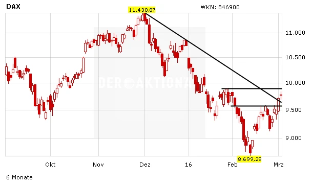 DE AKTIONÄR ist seit wenigen Tagen long im Markt. Bei etwa 9.600 Punkten wurde an dieser Stelle der Turbo-Optionsschein mit der WKN DG0KPD zum Kauf empfohlen. Auf dem aktuellen Niveau sollten bestehende Long-Positionen ausgebaut werden, da kurzfristig mit einem Anstieg in den Bereich von 10.000 Punkten zu rechnen ist. Mehr zum DAX sehen Sie im täglichen DAX-Check bei DER AKTIONÄR TV (www.deraktionaer.tv) oder lesen Sie an dieser Stelle.