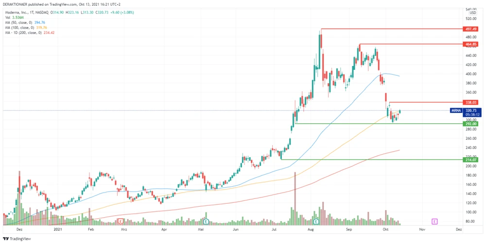 Bis Mitte August erfreuten sich Anleger mit Papieren von Moderna im Depot an hohen Kursgewinnen. Alleine seit Jahresbeginn legte die Aktie bis zum Allzeithoch bei 497 Dollar um traumhafte 383 Prozent zu. Dann setzten Gewinnmitnahmen ein und der Kurs korrigierte bisher um rund 40 Prozent.
