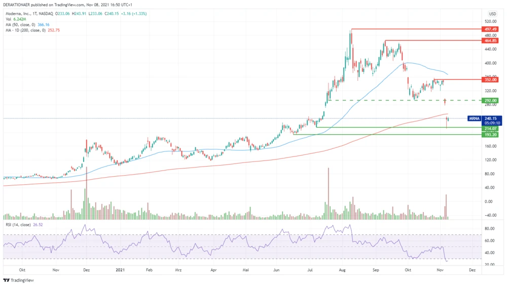 Nachdem nun auch Pfizer eine Zulassung für ein Corona-Medikament beantragt hat, kam die Aktie von Moderna heftig unter Druck. Anfang August kratze der Titel mit dem Allzeithoch noch an der 500-Dollar-Marke. Am vergangenen Freitag fiel der Kurs nun sogar durch den GD200 bei 252 Dollar. Die Talfahrt stoppe fast punktgenau an der Unterstützung bei 214 Dollar. Zusätzlich steht bei der psychologisch wichtigen 200-Dollar-Marke ein weiterer Support bereit. Fällt auch dieses Kurslevel, droht eine weitere Verkaufswelle.