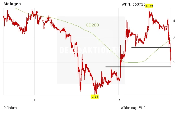 Die Aktie von Mologen fiel im Zuge des Kurseinbruchs unter den empfohlenen Stopp des AKTIONÄR bei 2,90 Euro und wurde verkauft. Charttechnisch ist das Papier nun klar angeschlagen. Anleger warten ein positives Signal beziehungsweise positive News wie beispielsweise den Abschluss eines Lizenzdeals ab.