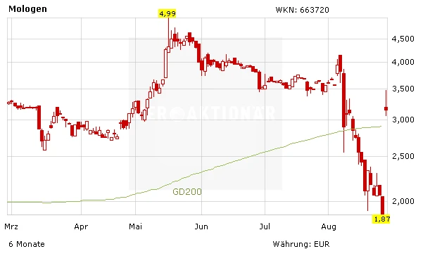 DER AKTIONÄR hatte es zuletzt bereits angedeutet, dass ein Lizenzdeal wichtig wäre. Dieser ist nun gelungen und für Mologen damit ein wichtiger Schritt. Auch aus charttechnischer Sicht sieht es bei Mologen mit einem Schlag wieder besser aus. Mit dem heutigen Kurssprung hat das Papier die 200-Tage-Linie zurückerobert.