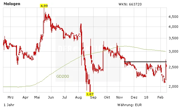 Nach dem Kurssprung am Dienstag muss die Aktie von Mologen am heutigen Mittwochmorgen allerdings ein paar Federn lassen: Der Wert verliert gut drei Prozent auf 2,53 Euro. Die Aktie von Mologen bleibt ein sehr spekulativer Wert, kann das Unternehmen jedoch mit weiteren positiven News überzeugen, dürfte die Aktie langfristig deutlich höher notieren. Aus charttechnischer Sicht ist wichtig, dass der Titel relativ schnell die Hürde im Bereich von 2,70 Euro nachhaltig überwinden kann und im zweiten Schritt die 200-Tage-Linie im Bereich von drei Euro.