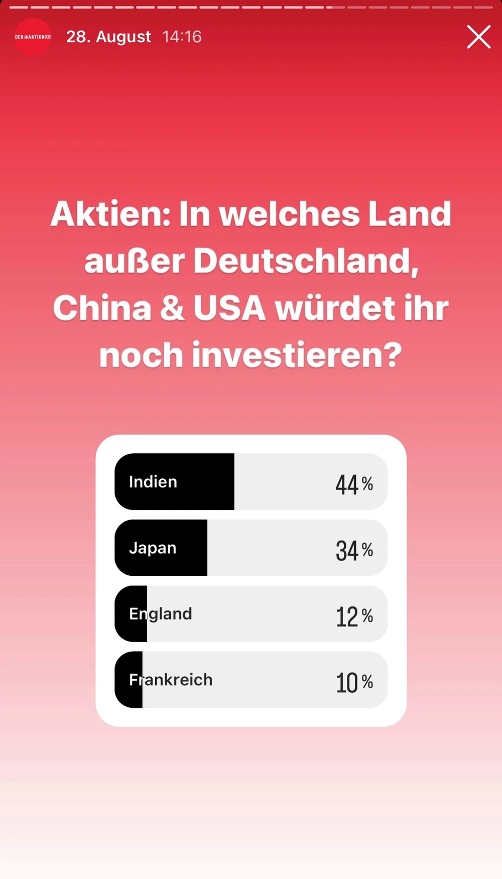 Eine aktuelle Umfrage auf Instagram unter AKTIONÄR-Lesern hat ergeben, dass auch deutsche Privatanleger bullish für Indien sind. 44 Prozent der Teilnehmer haben demnach angegeben, neben Deutschland, China und den USA am ehesten in Indien investieren zu wollen.