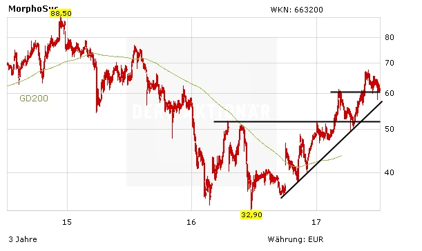 Zudem dürften im Laufe des Jahres weitere Daten insbesondere zu den eigenen Forschungsprojekten veröffentlicht werden. DER AKTIONÄR sieht Morphosys weiter als erstklassiges Investment im Biotechbereich. Läuft alles nach Plan, könnte der Wert auf Jahressicht durchaus wieder das 2014er-Hoch bei 88,50 Euro ins Visier nehmen.
