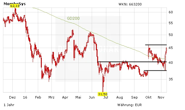 Und Guselkumab könnte in nächster Zeit zum großen Kurstreiber werden. Möglicherweise gelingt es Morphosys, im kommenden Jahr das erste Projekt zur Zulassung zu bringen. Demnächst stehen hierfür abschließende Ergebnisse an. Charttechnisch ist der Aktie von Morphosys mit dem Anstieg in den vergangenen Tagen der Ausbruch nach oben gelungen. Anleger sollten sich ein paar Stücke ins Depot legen.