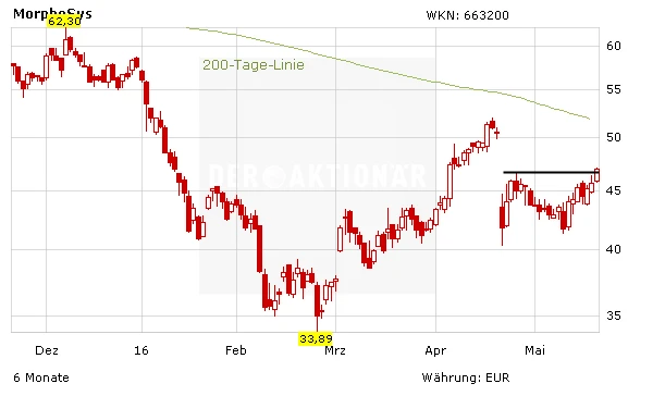 Die Aktie von Morphosys hat zuletzt wieder Zugewinne verzeichnen können. Am Freitag gewinnt das Papier 2,8 Prozent auf 46,95 Euro. Damit ist Morphosys der Sprung über den ersten kleinen Widerstand bei 46,63 Euro gelungen. Ein wirkliches Kaufsignal würde allerdings erst der Sprung über die 200-Tage-Linie bringen, die jenseits der 50-Euro-Marke verläuft.