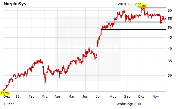 Auch DER AKTIONÄR ist vom weiteren Erfolg der im TecDAX notierten Biotechgesellschaft überzeugt und empfiehlt weiter investiert zu bleiben. Derzeit befindet sich die Morphosys-Aktie nach der starken Rallye der vergangenen Wochen auf einem gesunden Konsolidierungskurs. In einem weiterhin positiven Marktumfeld für Biotechwerte könnte Morphosys aber schon bald Anlauf auf das Mehrjahreshoch bei 62 Euro nehmen. Anleger lassen ihre Gewinne von mittlerweile mehr als 200 Prozent laufen, sichern die Position aber mit einem Stopp bei 42 Euro nach unten ab.