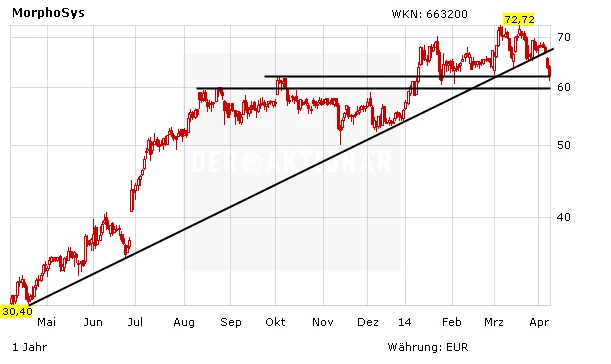 Wie an der Schnur gezogen ist die Aktie von Morphosys in den vergangenen Monaten von einem Hoch zum nächsten geklettert. Seit einigen Tagen ist es nun aber vorbei mit der Party. Vom Mehrjahreshoch bei 72,72 Euro hat der im TecDAX notierte Biotechwert mittlerweile mehr als zehn Euro verloren. Auch am heutigen Dienstag gehört Morphosys mit einem Minus von 2,8 Prozent auf 61,94 Euro erneut zu den größeren Verlierern.