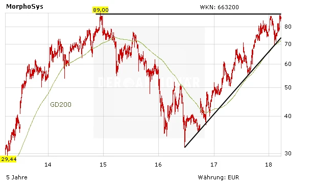 Die Aktie von Morphosys hat seit ihrem Zwischentief Mitte Februar zuletzt wieder deutlich zulegen können. Überzeugen konnte das Unternehmen auch auf der jüngsten Bilanzpressekonferenz. Sowohl die Zahlen für 2017 also auch der Ausblick stimmen. Der Fokus liegt aber ganz klar auf der Pipeline von Morphosys, die in den kommenden Monaten für starken Newsflow sorgen könnte. Kann Morphosys mit positiven Nachrichten überzeugen, dürfte es nur eine Frage der Zeit sein, bis auch der charttechnische Widerstand im Bereich von 88,50 Euro überwunden und ein großes charttechnisches Kaufsignal generiert werden kann. Auch die Analysten präsentieren sich fast durchwegs optimistisch.