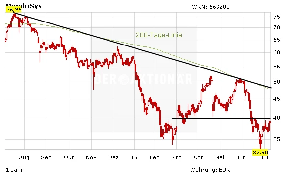 Auch DER AKTIONÄR sieht bei der Aktie von Morphosys mittelfristig großes Potenzial. Zuletzt waren allerdings einige Short-Seller am Werk, die neben einigen Unternehmensnews zusätzlich auf den Kurs gedrückt haben. Gelingen Morphosys tatsächlich Ende des Jahres positive Phase-3-Daten zu Guselkumab, könnte bereits im kommenden Jahr die erste Zulassung erfolgen. Dies wäre insbesondere aus psychologischer Sicht ein wichtiger Durchbruch für Morphosys und die gesamte deutsche Biotech-Szene. Kurzfristig wäre nun wichtig, dass der Widerstand bei 40 Euro nach oben überwunden werden kann.