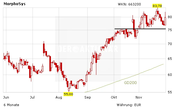 Die Aktie von Morphosys reagiert auf die Meldung mit einem deutlichen Kurssprung von vier Prozent und ist hinter Wirecard der zweitbeste Wert des Tages im TecDAX. Damit nimmt das Papier wieder Kurs auf das Mehrjahreshoch bei 89 Euro, das Ende 2014 markiert wurde. Der Wert bleibt weiter ein Kauf.