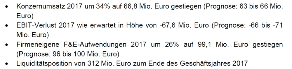 Auf der Umsatzseite schloss Morphosys das Geschäftsjahr 2017 über der Prognose an, das negative EBIT bewegt sich im Rahmen der hauseigenen Schätzungen. Zudem verfügt Morphosys zum Jahresende über 312 Millionen Euro an liquiden Mitteln.