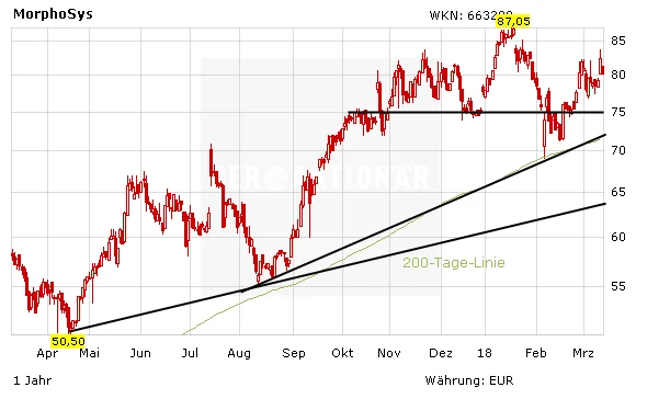 Der höhere angekündigte Verlust dürfte heute massiv auf die Stimmung drücken. Mutige Anleger versuchen im Bereich von 75,00 Euro abzustauben, sollten die Position allerdings mit einem Stoppkurs bei 70,00 Euro absichern. Wer langfristig bei der Biotech-Schmiede engagiert ist, bleibt an Bord. Denn an den starken Zukunftsaussichten hat sich bei Morphosys nichts geändert.