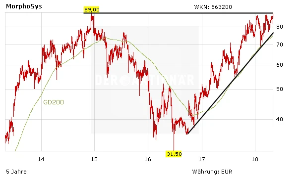 MOR106 zählt neben MOR208 zu den vielversprechendsten Forschungsprojekten von Morphosys. Kann das Unternehmen weiterhin mit derart positivem Newsflow wie zuletzt punkten, dürfte die Aktie relativ schnell die Hürde von 100 Euro nehmen können. Zuvor gilt es allerdings, das Mehrjahreshoch bei 89 Euro zu knacken. Hiervon ist die Aktie nur noch ganz knapp entfernt. Ein Sprung darüber wäre ein klares Kaufsignal. DER AKTIONÄR zählt Morphosys weiter zu seinen Top-Favoriten.