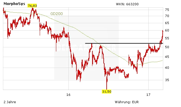 Die Aktie haussiert derzeit dementsprechend. Bereits am Freitag war das Papier der größte Gewinner im TecDAX und auch zum Wochenbeginn führt Morphosys den Index an. Schon bald könnte nun der Sprung über die nächste charttechnische Hürde im Bereich von 60 Euro gelingen.