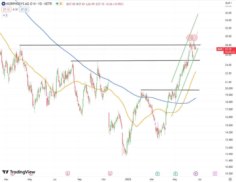 Charttechnisch versucht sich Morphosys bisher vergebens an der Horizontalen bei 27,97 Euro und hat dabei ein Doppel-Top ausgebildet. Zuvor war die Aktie seit Ende März um ganze 123 Prozent nach oben geschossen.