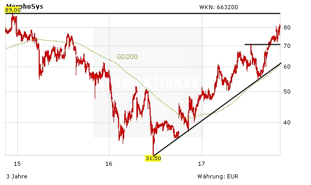 DER AKTIONÄR bleibt ebenfalls optimistisch, was die weitere Entwicklung von Morphosys angeht. Die Aktie nähert sich derzeit dem Mehrjahreshoch bei 89 Euro. Ein Sprung darüber wäre als klares Kaufsignal zu werten. In diesem Jahr stehen noch einige interessante Ereignisse an, die die Aktie weiter beflügeln könnten. Unter anderem präsentiert die Gesellschaft auf der bevorstehenden Jahrestagung der American Society of Hematology (ASH) am 11. Dezember weitere Daten zum firmeneigenen Antikörper MOR208. Zudem wird noch die EU-Zulassung für Tremfya (Guselkumab) erwartet. Im Sommer dieses Jahres erlangte man bereits die Genehmigung in den USA.