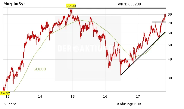 Die Aktie von Morphosys hat zuletzt bereits wieder deutlich an Fahrt aufgenommen. Die nächste große Hürde ist das Mehrjahreshoch bei 89 Euro. Gelingt der Sprung darüber, wäre dies ein weiteres klares Kaufsignal. Anleger lassen bei Morphosys ihre Gewinne weiter laufen, auch für Zukäufe ist es noch nicht zu spät.