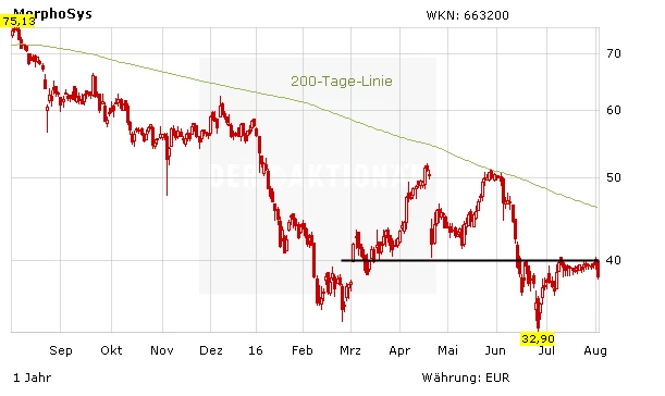 Die Aktie von Morphosys ist zuletzt erneut am Widerstand bei 40 Euro gescheitert und damit weiterhin charttechnisch angeschlagen. Spannend wird es aber zum Jahresende hin, wenn die Phase-3-Daten zu Guselkumab veröffentlicht werden. Morphosys bleibt höchst aussichtsreich, vor einem Neueinstieg sollte aber ein positives Signal abgewartet werden. Am Mittwochmorgen gewinnt das Papier gut zwei Prozent.