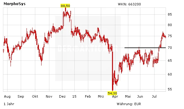 Die Baader Bank hat die Einstufung für Morphosys nach Erhalt der Meilensteinzahlung auf "Buy" mit einem Kursziel von 88 Euro belassen. Die Nachricht sei ein weiterer Beleg für den anhaltenden Antikörper-Ausstoß aus der Produktpipeline des Biotech-Unternehmens, schrieb Analyst Olav Zilian in einer Studie vom Donnerstag. Auch DER AKTIONÄR bleibt bei seiner optimistischen Einschätzung zur Morphosys-Aktie und empfiehlt mit einem Stopp bei 54,00 Euro weiter investiert zu bleiben. Morphosys könnte durchaus auch als Übernahmekandidat für den einen oder anderen Pharmakonzern interessant werden. Insbesondere Novartis könnte ein möglicher Interessent sein.
