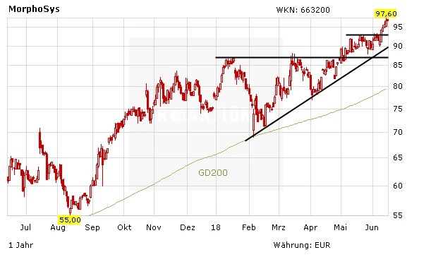 Die Aktie von Morphosys präsentiert sich derzeit enorm stark. Zuletzt hat das Papier mit dem Sprung auf ein neues Mehrjahreshoch ein neues Kaufsignal generiert. Die nächste insbesondere psychologisch wichtige Hürde wartet nun bei 100 Euro. DER AKTIONÄR geht davon aus, dass diese