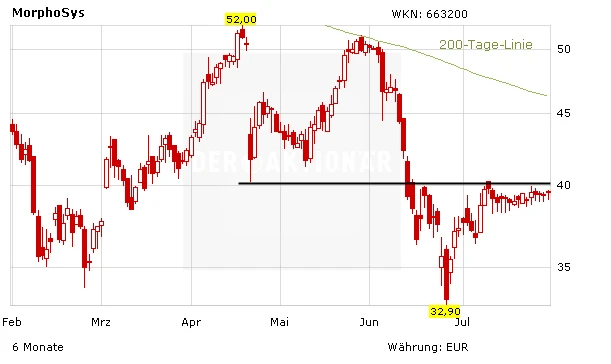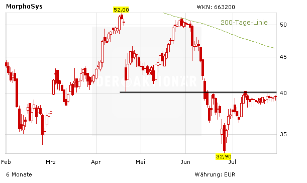 Die Aktie von Morphosys verliert am Montagmorgen leicht um 0,2 Prozent auf 39,58 Euro. Damit hängt das Papier weiter am Widerstand bei 40 Euro fest. Ein Sprung darüber würde weiteres Potenzial bis vorerst zur 200-Tage-Linie eröffnen.