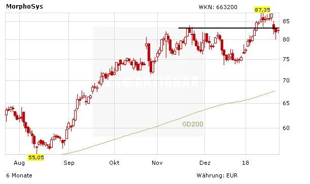 Zudem erhält Morphosys vom sich wieder schneller drehenden Übernahmekarussell in der Biotechbranche Unterstützung. Hier gibt es Spekulationen, nachdem es zuletzt bereits einige Übernahmen gab und Novo Nordisk zudem starkes Interesse an Ablynx zeigt, dass möglicherweise auch Morphosys als Übernahmekandidat ins Visier geraten könnte.