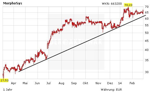 Mittlerweile haben die Analysten ihre Einschätzungen überarbeitet. So hat die Commerzbank die Einstufung für Morphosys nach Zahlen auf „Hold“ mit einem Kursziel von 65 Euro belassen. Der Umsatz im vierten Quartal ist etwas schwächer ausgefallen als geschätzt, das operatives Ergebnis und Gewinn je Aktie haben jedoch jeweils die Erwartungen getroffen, schrieb Analyst Daniel Wendorff in einer Studie vom Freitag. Der Ausblick des Biotechunternehmens aufs laufende Jahr hat nicht überrascht. Die DZ Bank ist optimistischer. Analyst Peter Spengler bestätigte die Kaufempfehlung mit einem Kursziel von 69 Euro. Mit dem guten Zahlenwerk für 2013 hat Spengler gerechnet, auch der Ausblick für 2014 entspricht Spenglers Erwartungen.